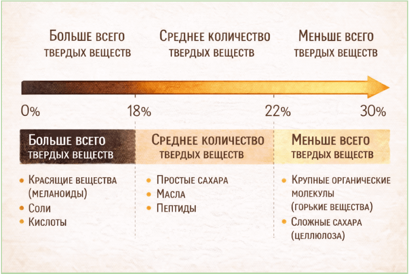 - Правая сторона (22-26%): Зона переэкстракции. Вкус горький, сухой, пустой. Сюда легко съезжает лунго, если через кофе пропустили слишком много воды.