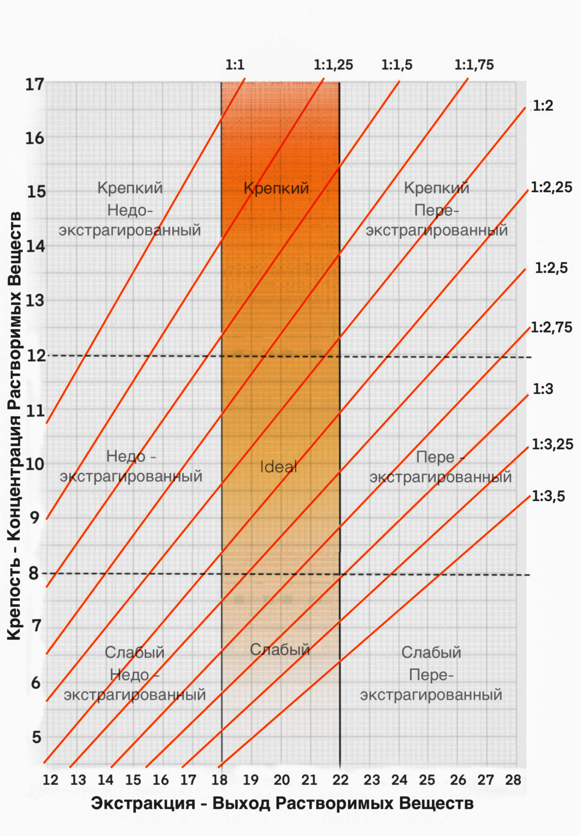Так то, что мы выварили из кофе в начале, будет составлять до 18% от веса молотого зерна, а то, что сверх необходимого (как раз обилие горьких соединений) - это более 22%. Диапазон от 18 до 22 - это идеальный диапазон экстракции (Ext %), то есть того, что мы можем достать из самого кофе.