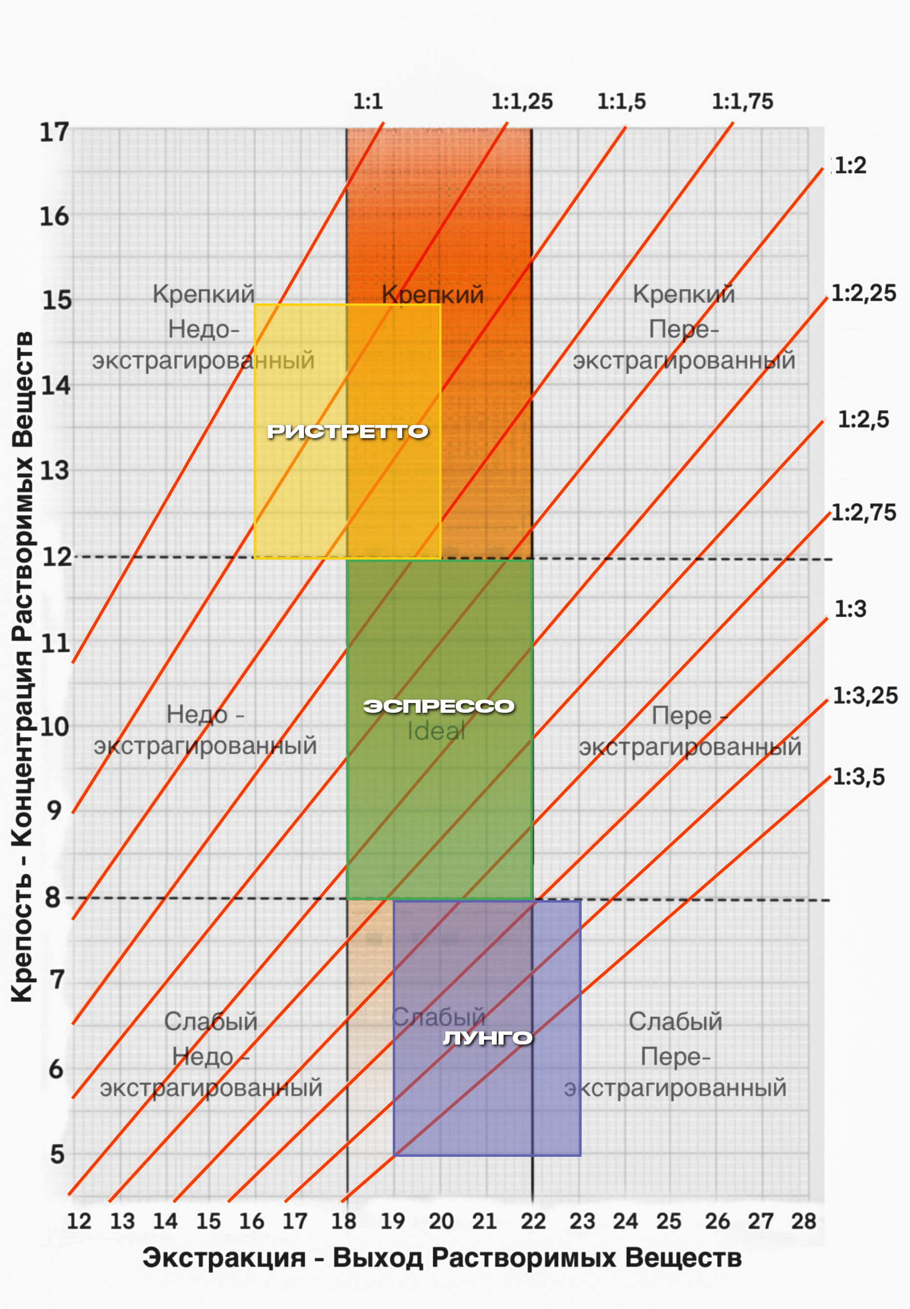 - Левая сторона (14-18%): Зона недоэкстракции. Сюда может попасть плохо приготовленный ристретто (если вода вообще не успела ничего извлечь) — вкус будет резким, кислым и соленым.