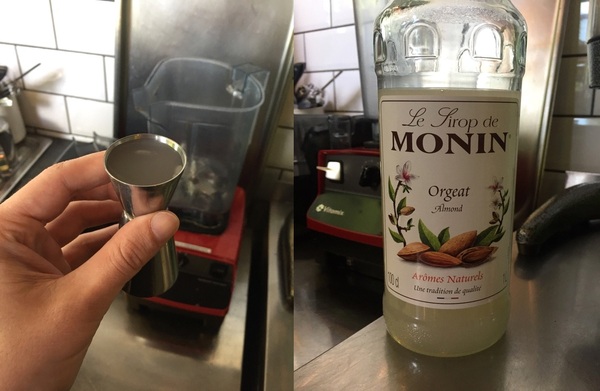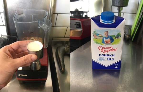 Затем 100 мл. десятипроцентных сливок и 25 мл. сиропа миндаль.