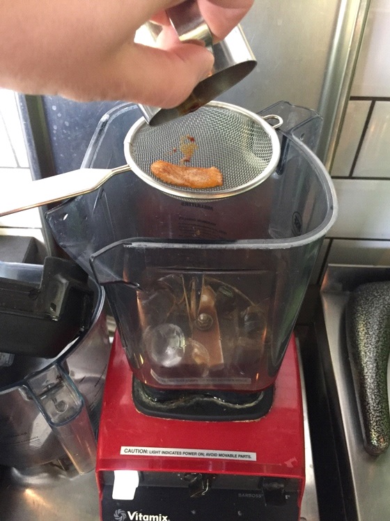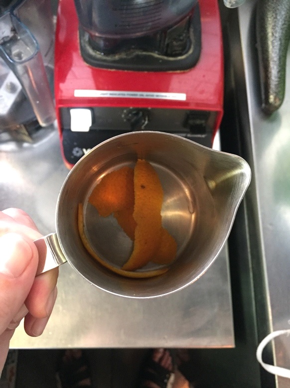 Приготовьте в питчер с цедрой доппио и оставьте для заваривания на 10 секунд. После этого, процедите доппио в смесительный стакан блендера так, чтобы цедра не попала в напиток.