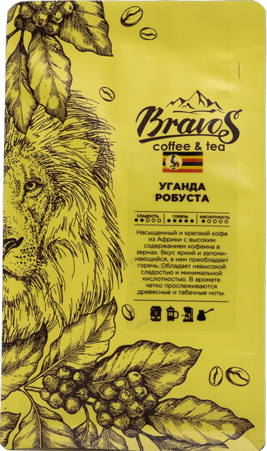 Настоящая качественная робуста из Центральной Африки. Степень обжарки – темная. Ее оценят любители крепкого кофе. В чашке этого напитка практически отсутствует кислинка и сладость. Он отличается высокой плотностью, терпкостью и очень высоким содержанием кофеина. Доминанта аромата – горький шоколад, четко прослеживаются древесные и табачные ноты. Вкус насыщенный, яркий и запоминающийся, в нем преобладает яркая ржаная горчинка.