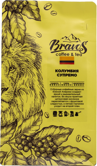 Это яркий и выразительный кофе из Южной Америки, который по праву считается эталоном кофейного вкуса. Отборные зерна арабики и средняя степень обжарки создают яркий и выразительный напиток, в котором сочетаются цитрусовая кислинка и фруктовая сладость. Мягкая шоколадная горчинка уходит на второй план. В аромате слышатся деликатные ноты экзотических фруктов. «Супремо» в названии сорта говорит о его высоком качестве.