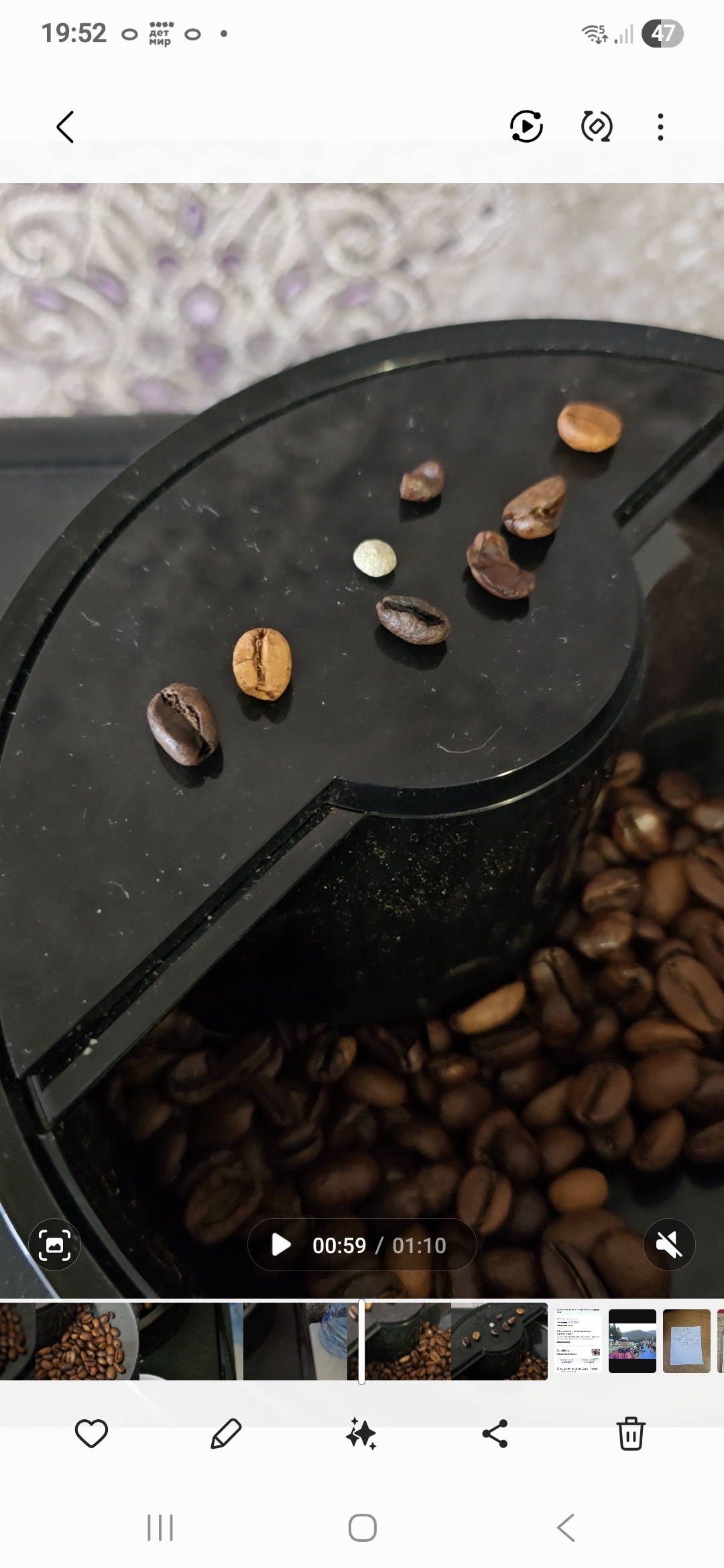 В пачке попался камень. Есть полное видео. Еще немного и непонятно что было бы с жерновами и кофе с "приятным" каменым вкусом. Зерно неоднородное, но это ладно, главное вкусно. Короче двоякие чуства о вашей продукции.